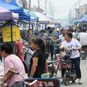 8月25日,在天津市靜海區臺頭鎮,前來趕集的村民在大集上購買商品。