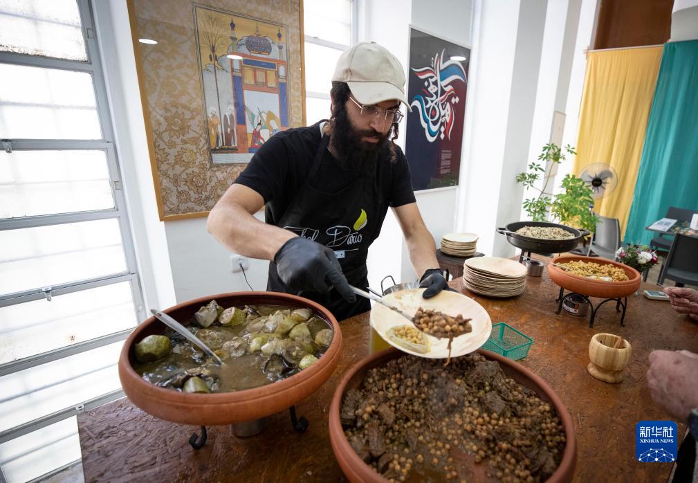 8月24日,在耶路撒冷舉行的古代阿拉伯世界飲食文化展上,廚師為參觀者提供古代阿拉伯美食同款套餐。