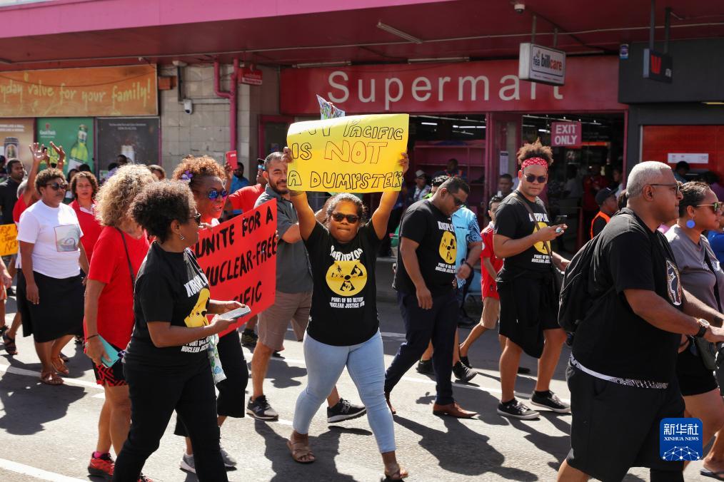 當(dāng)日,數(shù)百名斐濟(jì)民眾沿街游行,強(qiáng)烈抗議日本政府啟動福島第一核電站核污染水排海,呼吁國際社會采取行動保護(hù)太平洋生態(tài)和子孫后代的福祉。