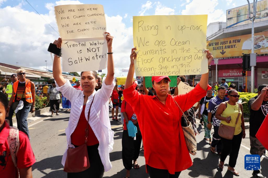 當(dāng)日,數(shù)百名斐濟民眾沿街游行,強烈抗議日本政府啟動福島第一核電站核污染水排海,呼吁國際社會采取行動保護太平洋生態(tài)和子孫后代的福祉。