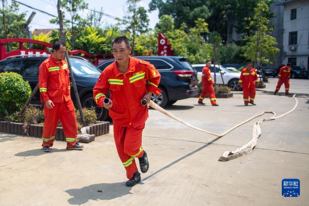 8月25日,在瀏陽市金剛鎮政府院內,黃蔚谷(左二)和同事們進行消防演練。