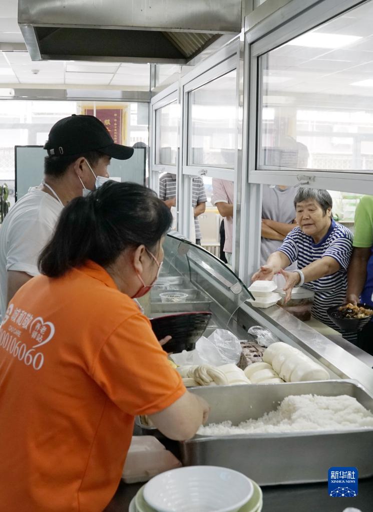 8月26日,十里堡社區(qū)的老年人在老年餐廳購買午飯。