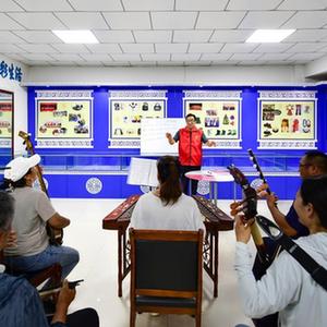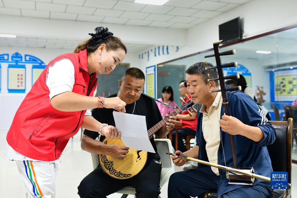 8月26日,在鄂托克前旗上海廟鎮阿勒臺嘎查文化活動中心美育課堂上,志愿者烏吉斯古楞(左)指導農牧民練習樂器演奏。