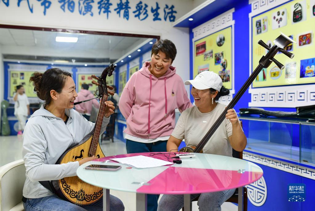 8月26日,在鄂托克前旗上海廟鎮阿勒臺嘎查文化活動中心美育課堂上,農牧民交流樂器演奏技藝。