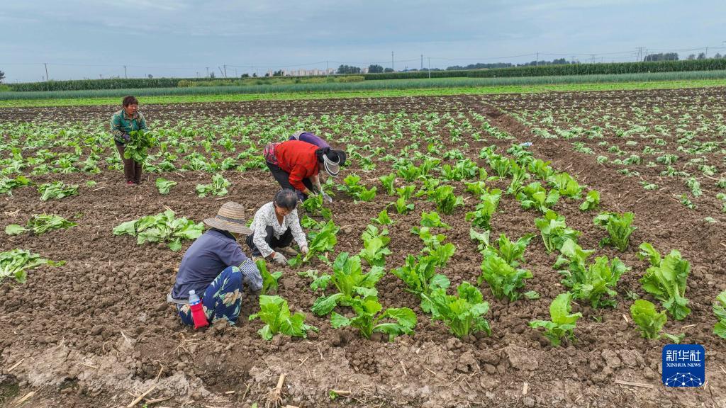 8月26日,河北省玉田縣玉田鎮農民在菜田移栽白菜。