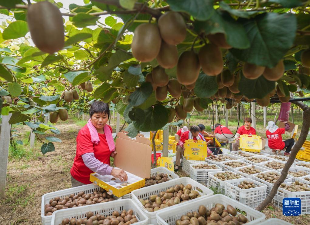 8月26日,山東省鄒平市黃山街道大李村獼猴桃農場農民把采摘的桃子裝盒銷售。