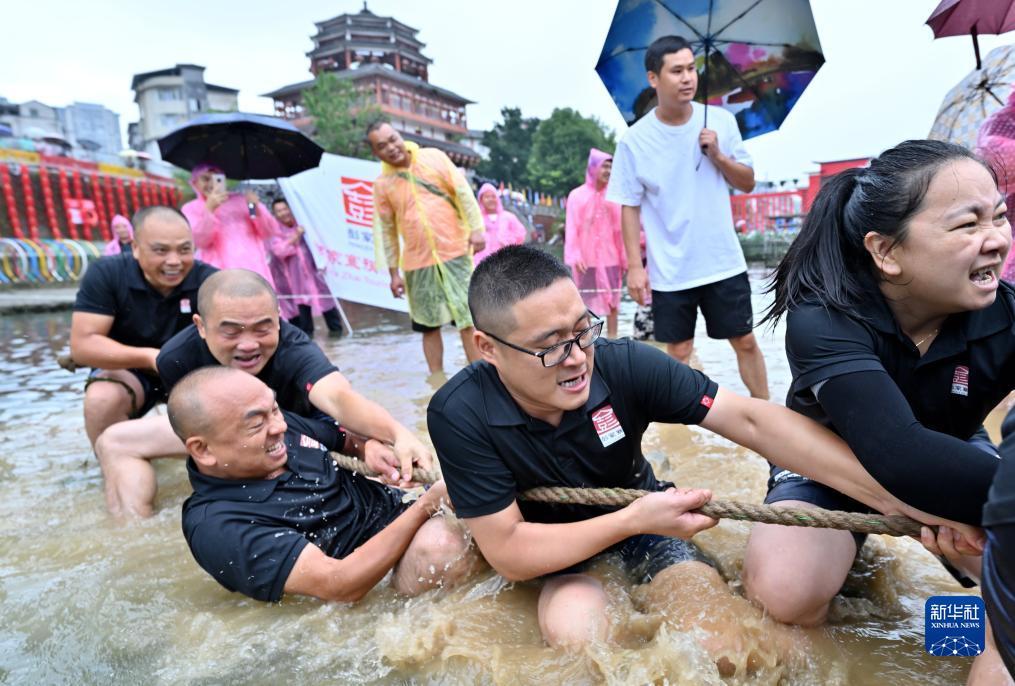 當日,在湖北省恩施土家族苗族自治州宣恩縣仙山貢水旅游區的貢水河中,近千名居民和游客組成60余支拔河隊在河中開展趣味拔河比賽,感受快樂與清涼。