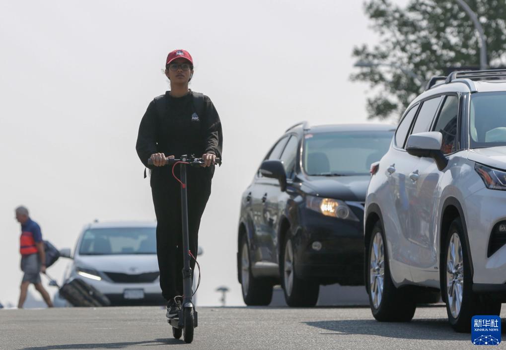 8月26日,在加拿大溫哥華,一名女子騎著電動(dòng)滑板車在煙霧籠罩的街道上行駛。