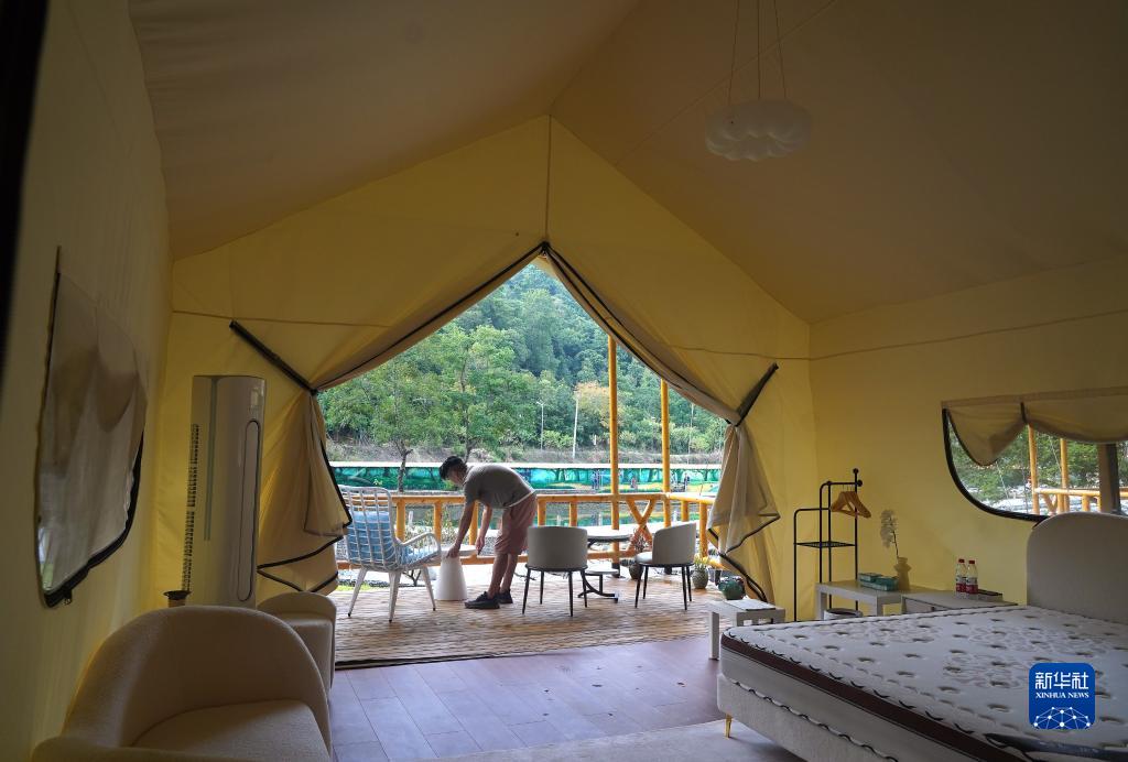 包希孟在打掃一間戶外帳篷,港背村瑪瑙巖森林小鎮的戶外帳篷營地不久后將對外開放(8月24日攝)。