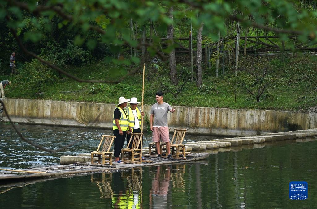 包希孟(右一)和漂流旅游項(xiàng)目的筏工交流(8月24日攝)。