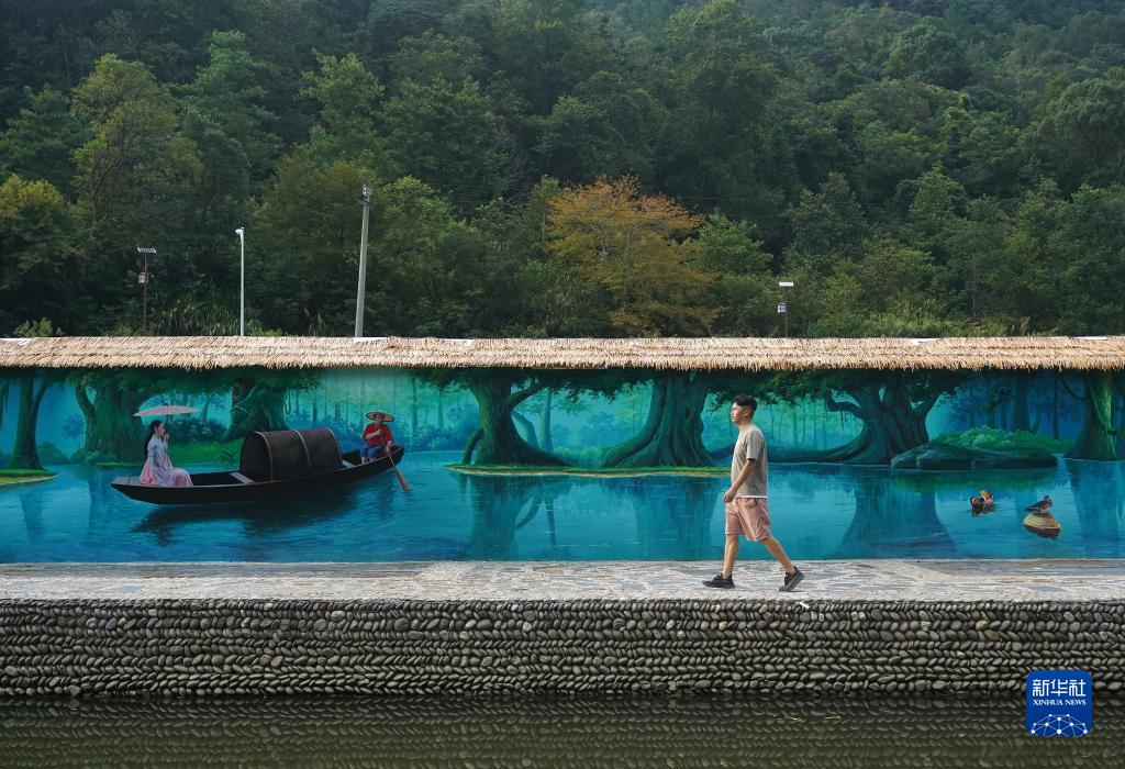 包希孟從生態(tài)泳池邊的彩繪墻前走過(8月24日攝)。
