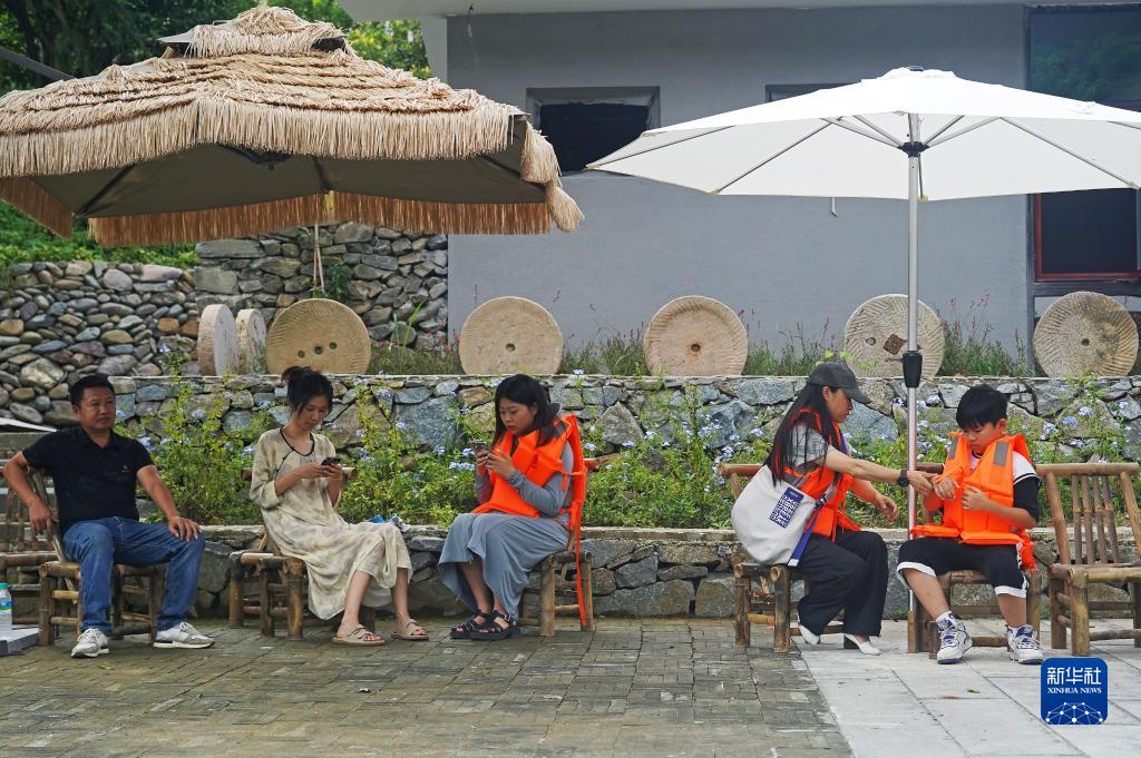 游客在碼頭休息區(qū)等待體驗(yàn)竹筏漂流(8月24日攝)。