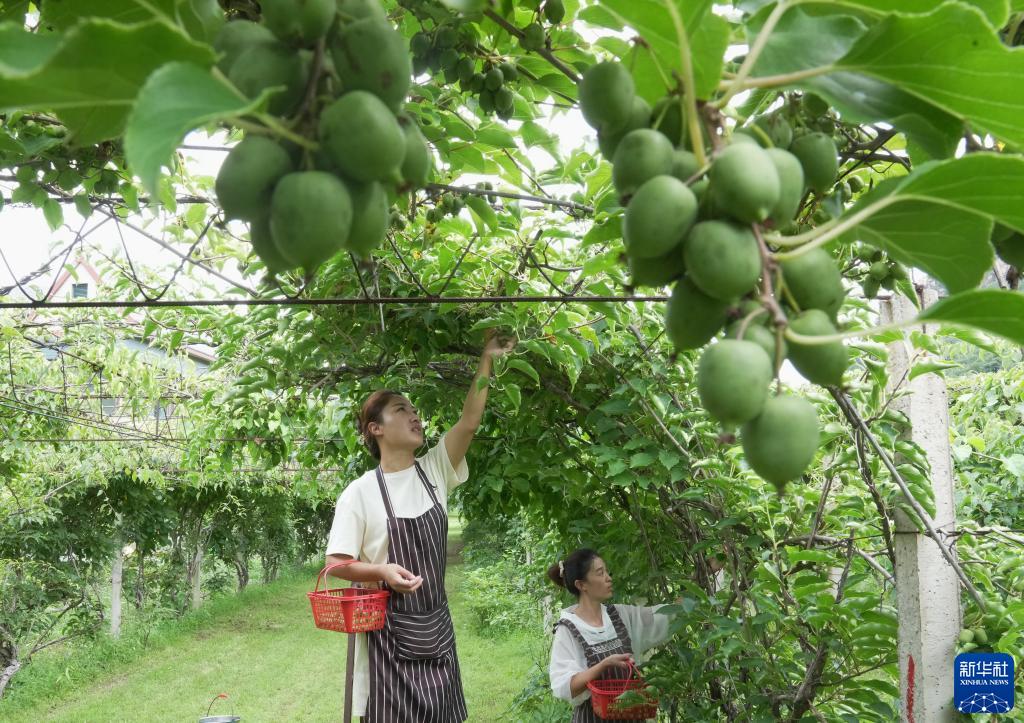 8月26日,秦皇島市海港區駐操營鎮花廠峪村軟棗獼猴桃種植基地的工人在采摘軟棗獼猴桃。