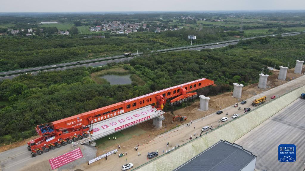 這是中國鐵建大橋局新建滬寧合高鐵全線首榀箱梁架設現場(8月27日攝,無人機照片)。