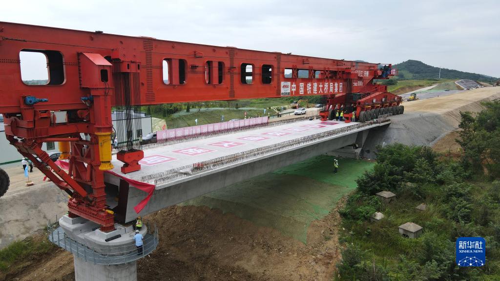 這是中國鐵建大橋局新建滬寧合高鐵全線首榀箱梁架設(shè)現(xiàn)場(8月27日攝,無人機照片)。