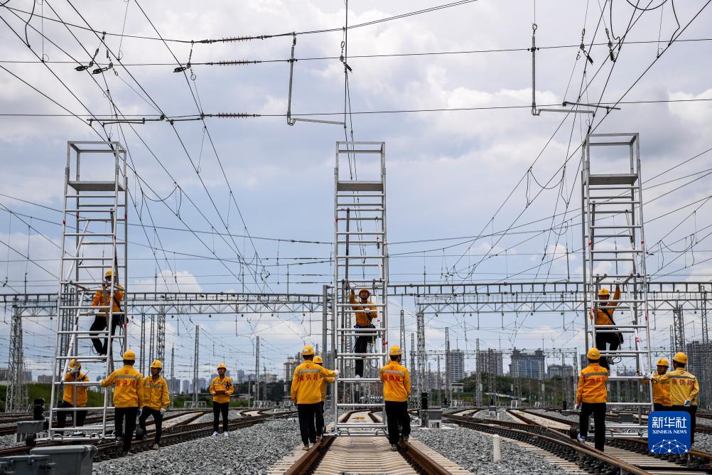 8月27日,中國鐵路南寧局集團有限公司南寧供電段的接觸網工在南寧第二動車所存車線內進行電路檢修作業。