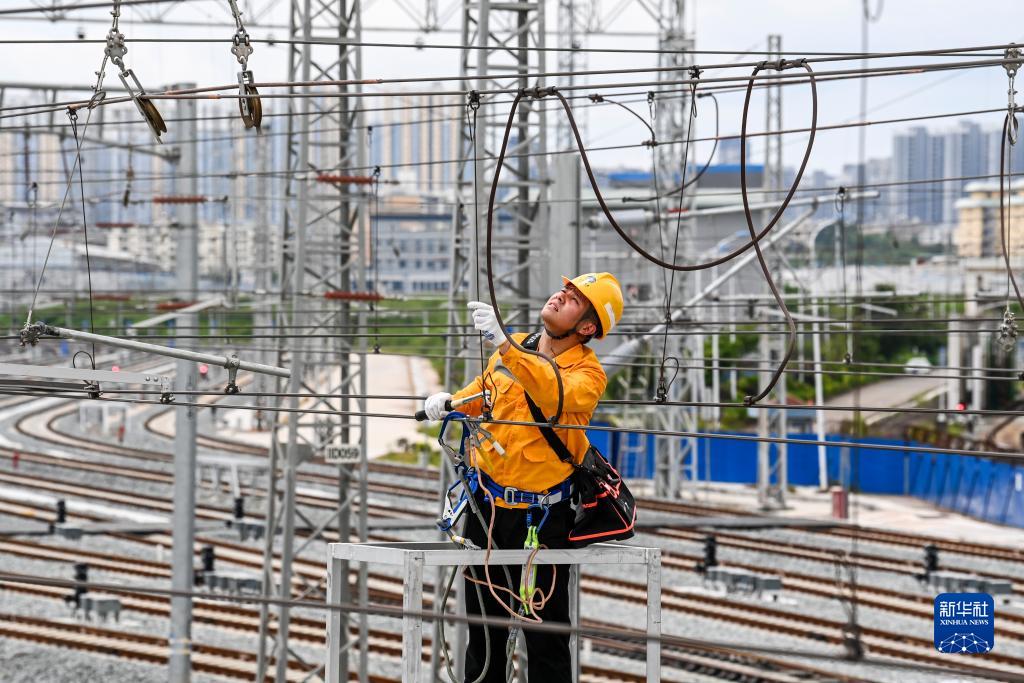 當日,中國鐵路南寧局集團有限公司南寧供電段的接觸網工對南寧第二動車所存車線內26條股道中達到檢調標準的股道進行檢查,為即將全線開通的貴南高鐵做準備。