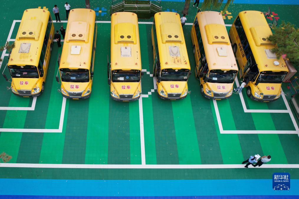 8月27日,石家莊市公安局藁城分局交通警察大隊(duì)民輔警在海英幼兒園對(duì)校車進(jìn)行安全檢查(無(wú)人機(jī)照片)。