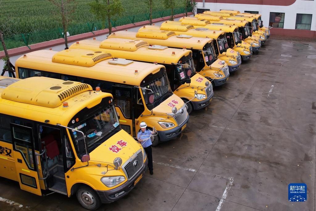 8月27日,石家莊市公安局藁城分局交通警察大隊輔警在天鶴教育集團對校車進行安全檢查(無人機照片)。