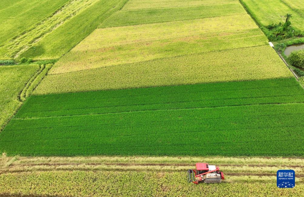 8月27日,在湖南省衡陽市衡陽縣臺源鎮,農機手駕駛收割機在收割稻谷(無人機照片)。