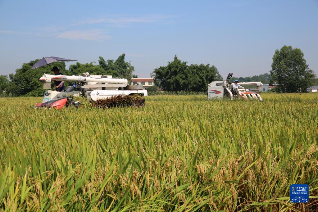 8月27日,在四川省眉山市東坡區(qū)太和鎮(zhèn)四維村,村民駕駛機(jī)械收割水稻。