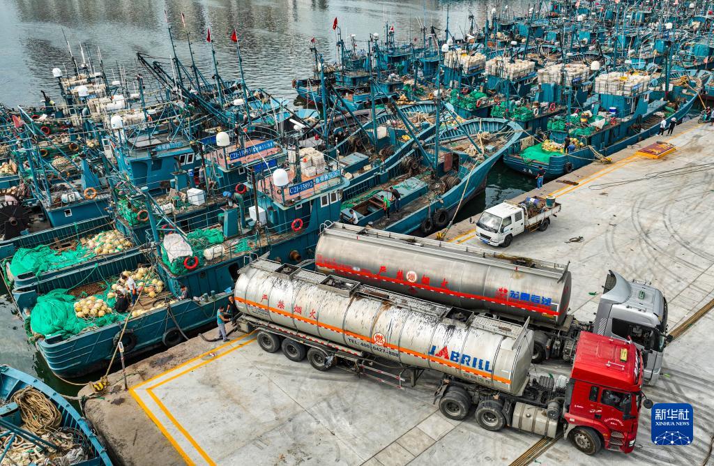 8月27日,一艘漁船在石島漁港碼頭加油(無人機照片)。