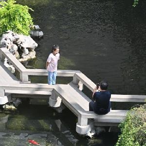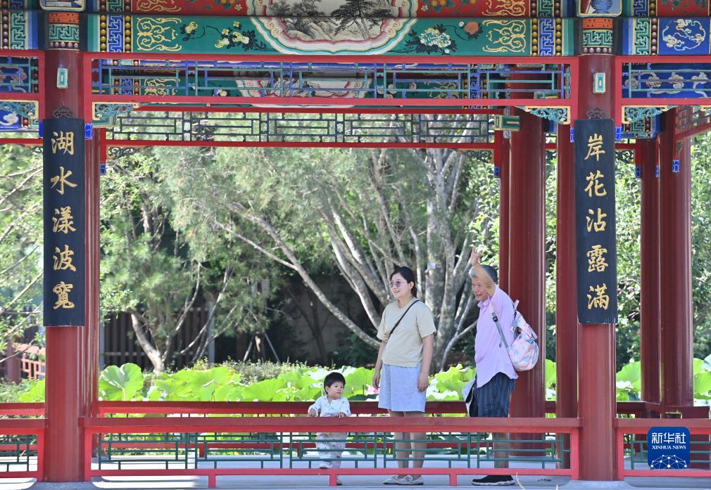 8月28日,參觀者在中國園林博物館鏡影亭參觀。