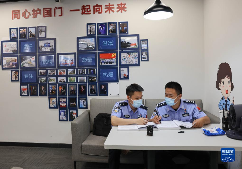 8月24日,在首都機(jī)場(chǎng)3號(hào)航站樓邊檢執(zhí)勤現(xiàn)場(chǎng)備勤室,兩位移民管理警察在交流專業(yè)知識(shí)和實(shí)操技能。