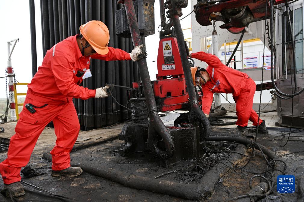 工作人員在中國石化塔里木盆地“深地工程”躍進3-3XC油氣井進行鉆井輔助作業(8月21日攝)。