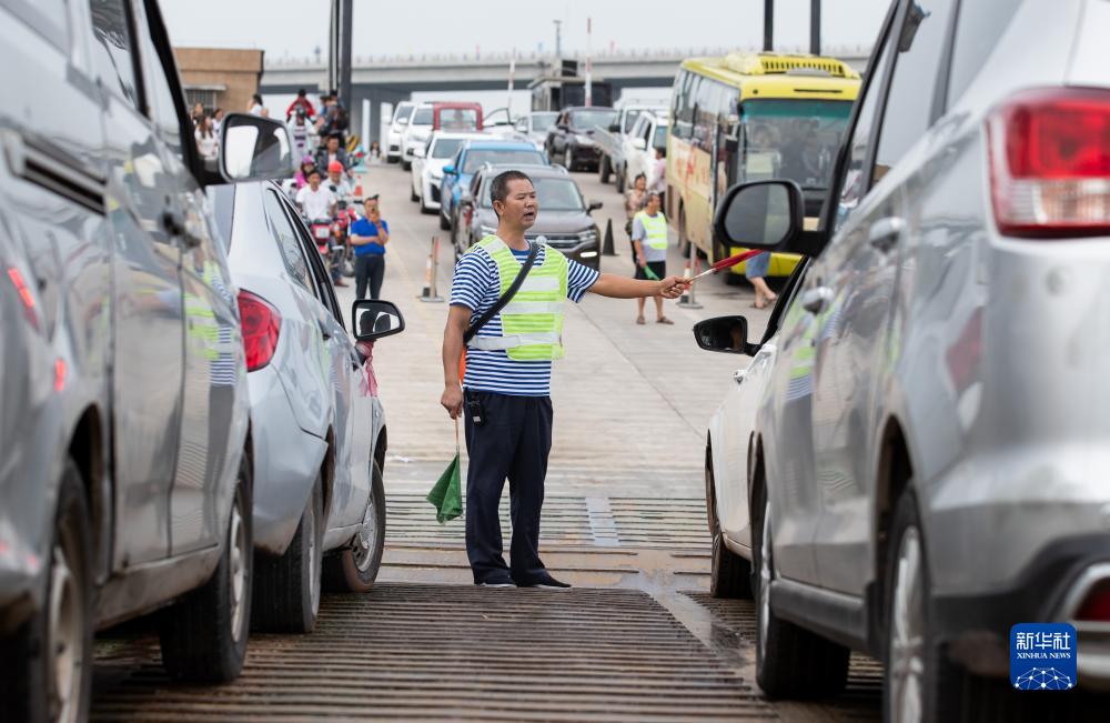 7月1日,車客渡船的水手鐘和林在甲板上指揮車輛。