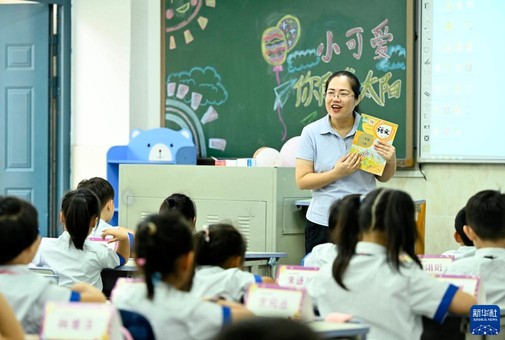 8月28日,廣西柳州市德潤(rùn)小學(xué)一年級(jí)教師向新生講解小學(xué)課本。
