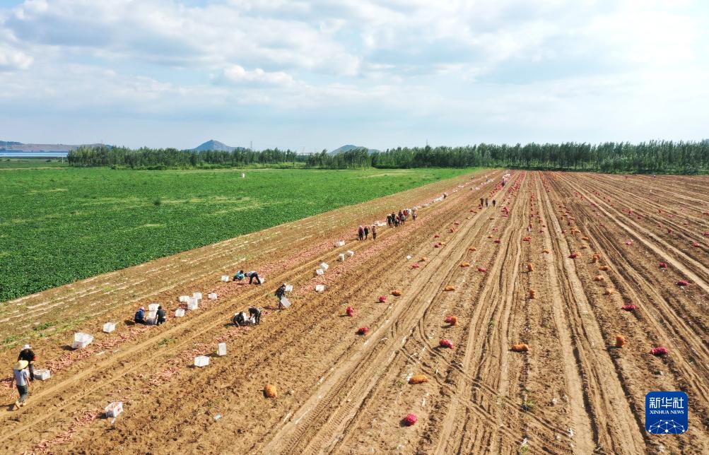8月28日,灤州市九百戶鎮一家鮮食紅薯種植合作社的社員在田間收獲煙薯(無人機照片)。