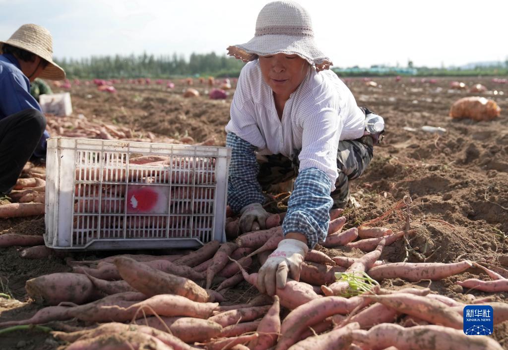 8月28日,灤州市九百戶鎮一家鮮食紅薯種植合作社的社員在田間收獲煙薯。