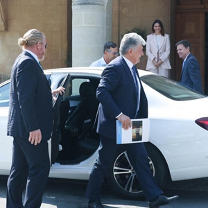 8月28日,在塞浦路斯尼科西亞,聯合國負責歐洲、中亞和美洲事務的助理秘書長米洛斯拉夫·延恰(前中)與塞浦路斯希臘族領導人、總統赫里斯托祖利季斯(前右)舉行會談。