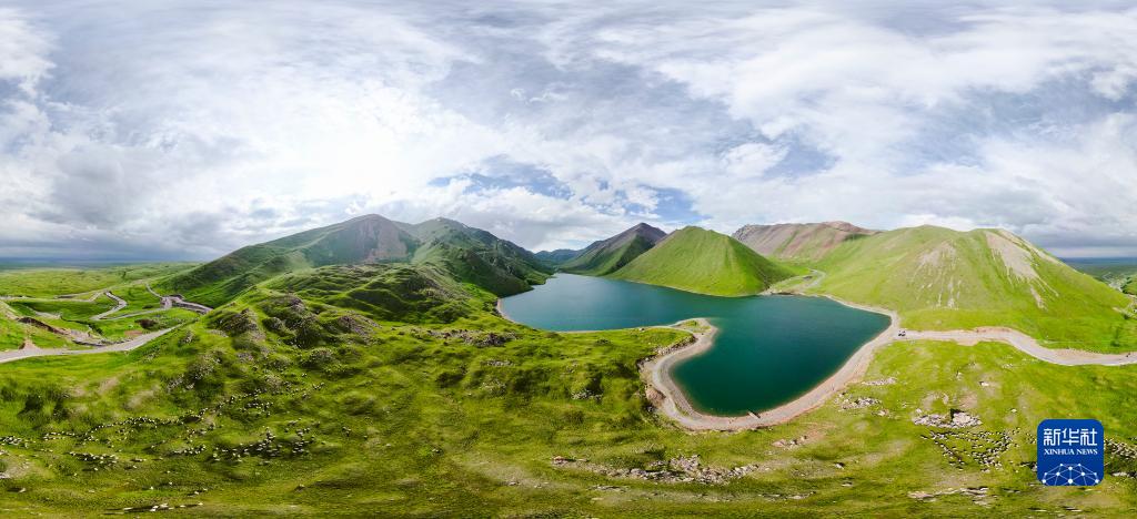 新疆巴音郭楞蒙古自治州和靜縣巴音布魯克草原羊群遍野(7月5日攝,無人機全景照片)。