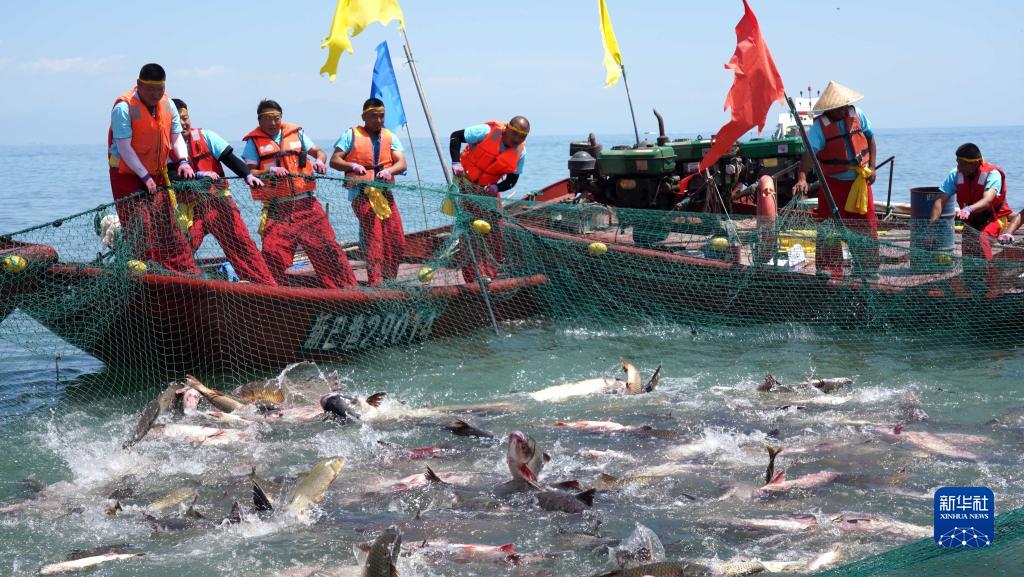 漁民在新疆博斯騰湖拉網捕魚(6月23日攝)。當日,新疆博斯騰湖第十六屆開湖季捕魚節開幕。經過三個多月的禁漁期,漁民捕獲開湖后的第一網魚。