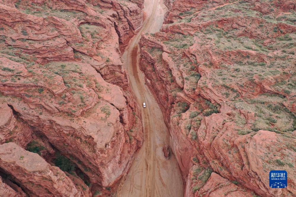 參與2023年環塔拉力賽的賽車疾馳在新疆阿克蘇地區溫宿縣大峽谷(5月21日攝,無人機照片)。