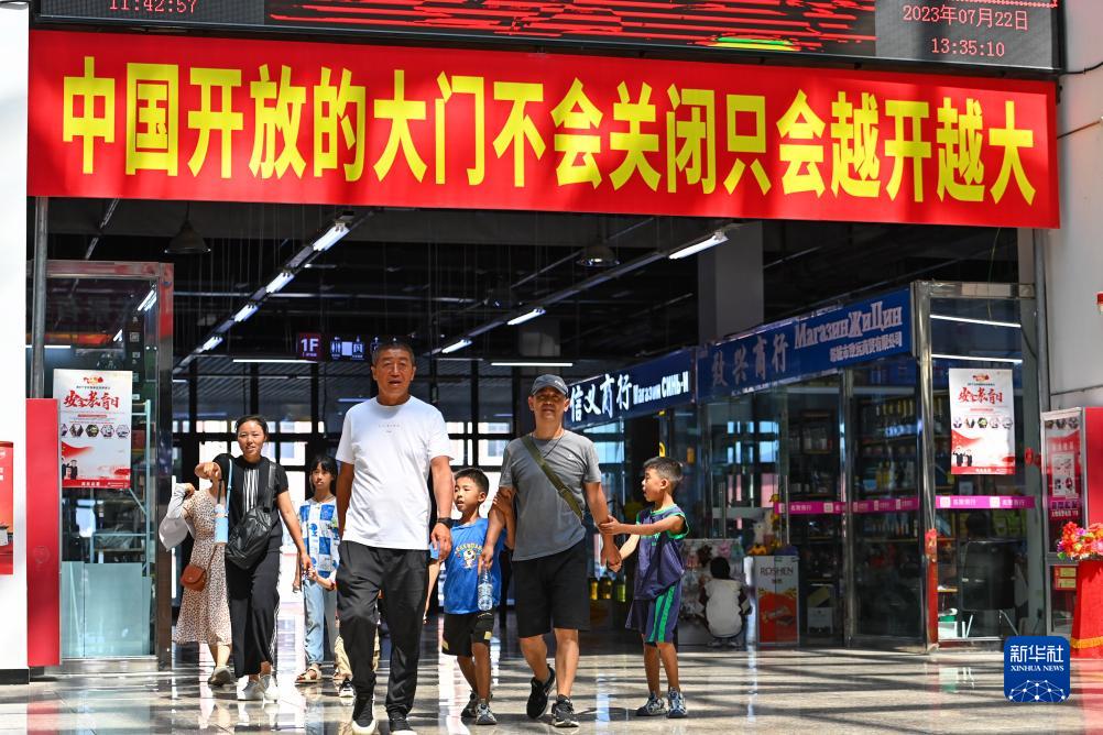 游客在新疆塔城巴克圖中哈邊民互市絲路文化商品城參觀游覽(7月22日攝)。