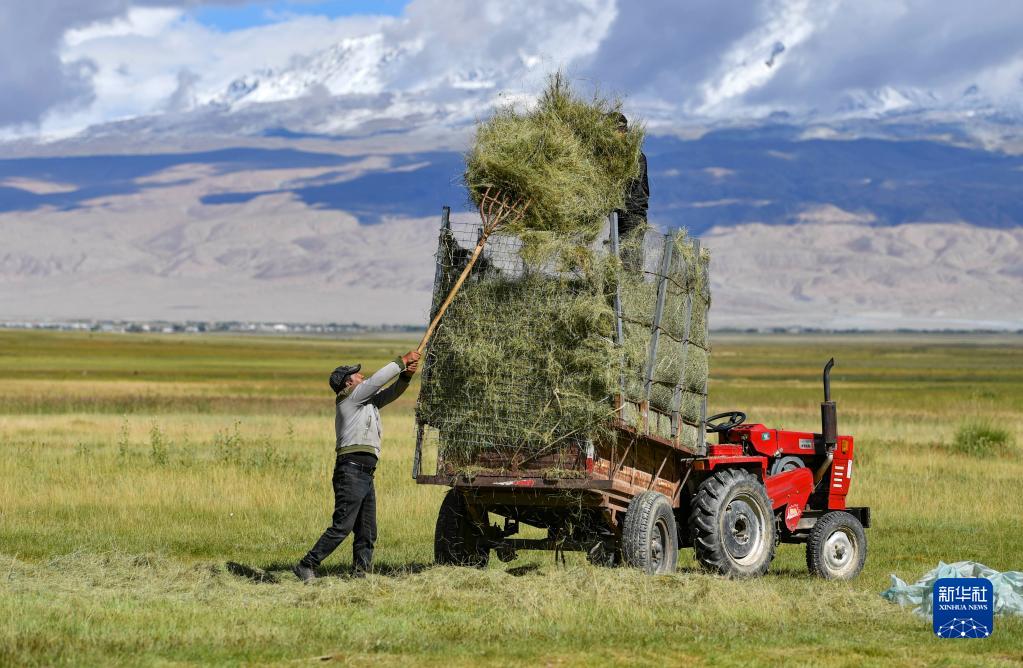 在新疆塔什庫爾干塔吉克自治縣塔合曼鄉(xiāng),牧民普拉提將收割的牧草裝車(8月27日攝)。