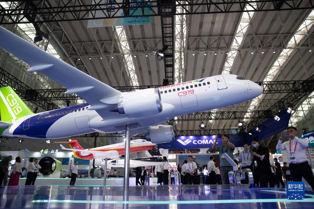 8月29日,參會者在中國商飛公司展廳拍攝C919飛機模型。