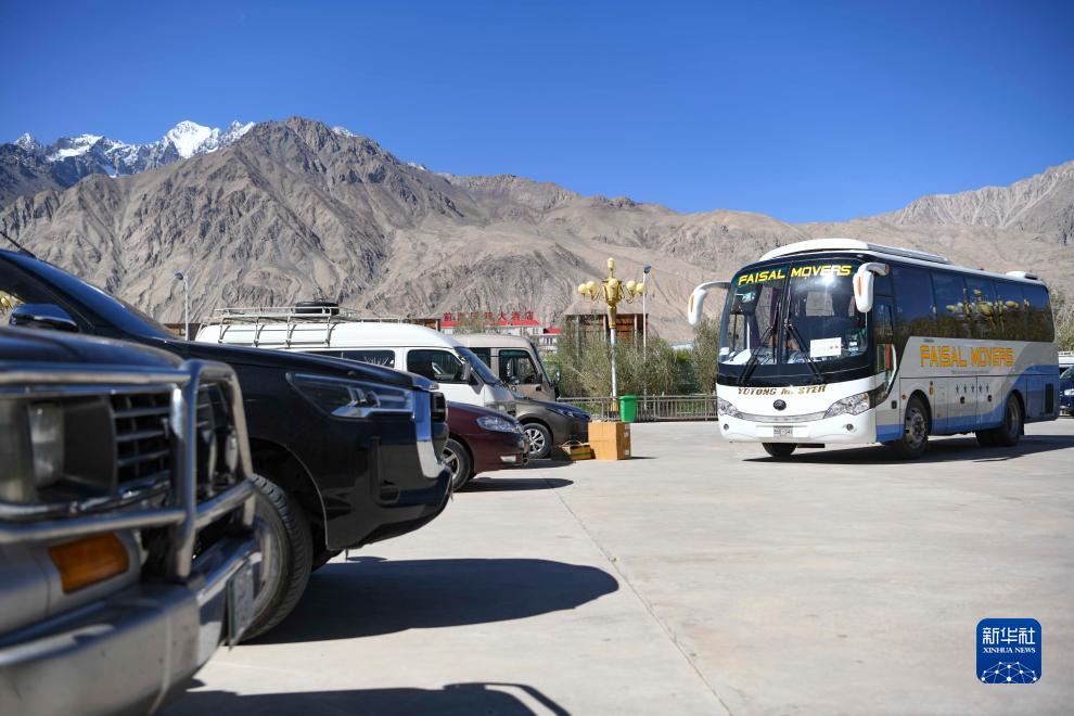 來自巴基斯坦的客車駛?cè)胄陆t其拉甫口岸(8月29日攝)。