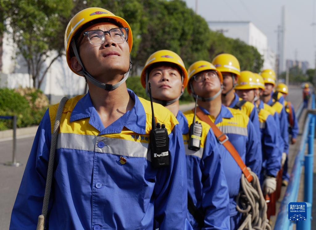8月29日,中國鐵路鄭州局集團有限公司鄭州供電段工作人員在鄭州北站編組場內準備攀爬燈橋進行檢修作業。