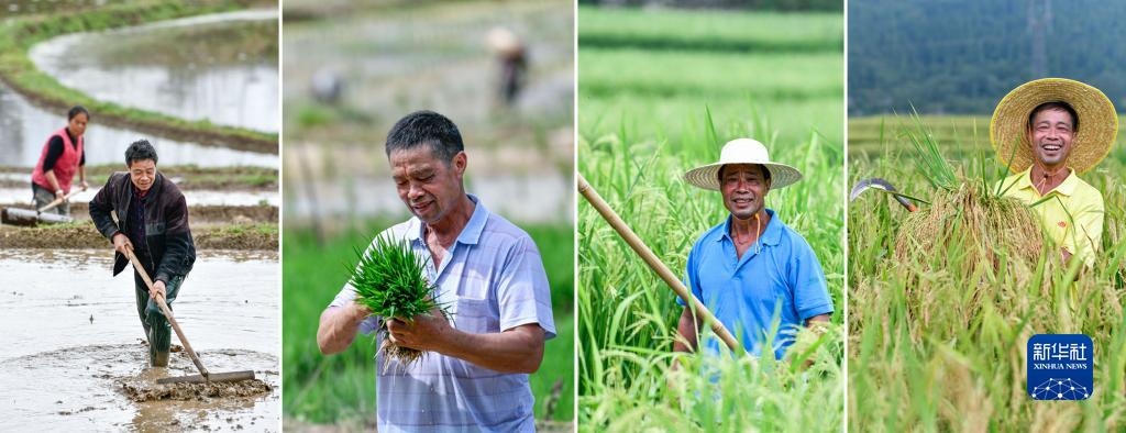 拼版照片:從左至右為4月6日,為陳良東在水稻制種基地里平整田塊,準(zhǔn)備播種;5月29日,陳良東在移栽秧苗;8月1日,陳良東在水稻制種基地里拿著竹竿,準(zhǔn)備給制種水稻“趕花”授粉;8月26日,陳良東展示收獲的水稻種子。