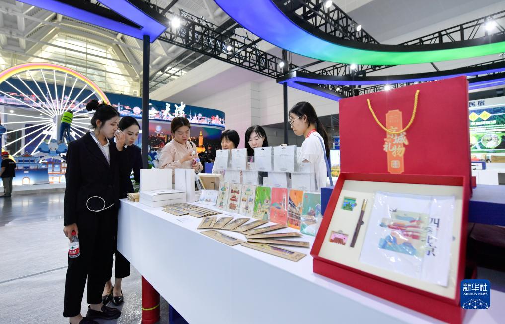 8月31日,在國家會展中心(天津),嘉賓及媒體記者參觀展出的旅游文創(chuàng)展品。