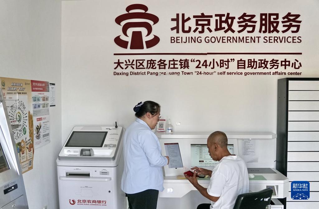 8月31日,大興區(qū)龐各莊鎮(zhèn)政務(wù)服務(wù)中心的工作人員幫助一位老人辦理金融業(yè)務(wù)。