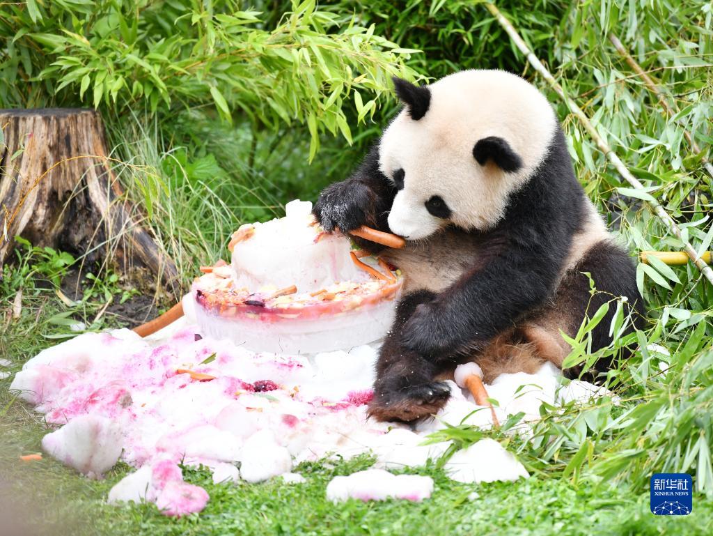 8月31日,大熊貓“夢想”在德國柏林動物園享用“生日餐”。