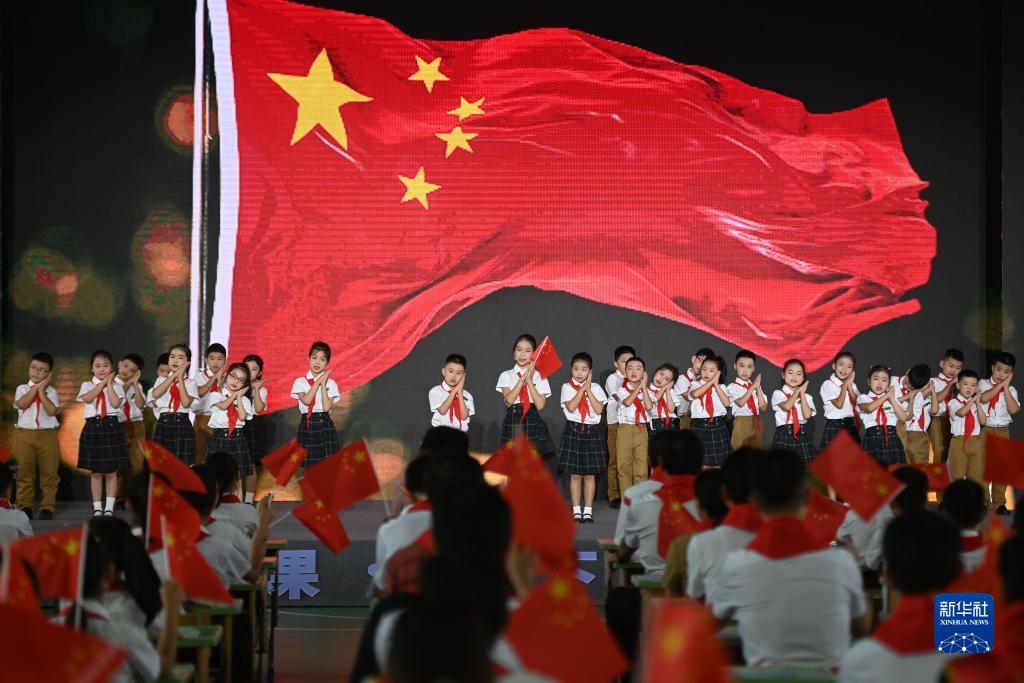 9月1日,浙江省寧波市奉化區錦屏中心小學的學生在活動上表演童聲合唱《國旗國旗真美麗》。
