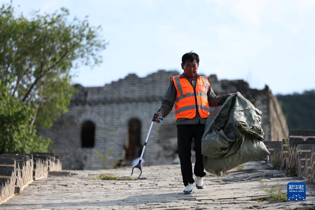 8月30日,衡丙三在長城上撿拾垃圾。