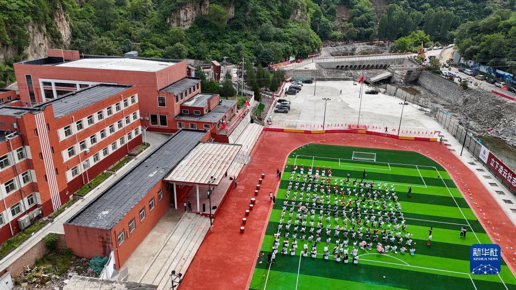 9月1日,在北京市房山區霞云嶺鄉霞云嶺中心小學,老師和學生在修繕一新的操場上參加開學典禮(無人機照片)。