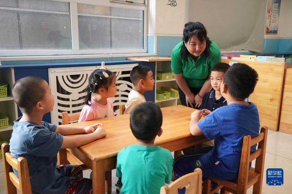 9月1日,在北京市門頭溝區京師實驗小學借址開學的京師實驗小學附屬幼兒園大班小朋友們與老師交流。